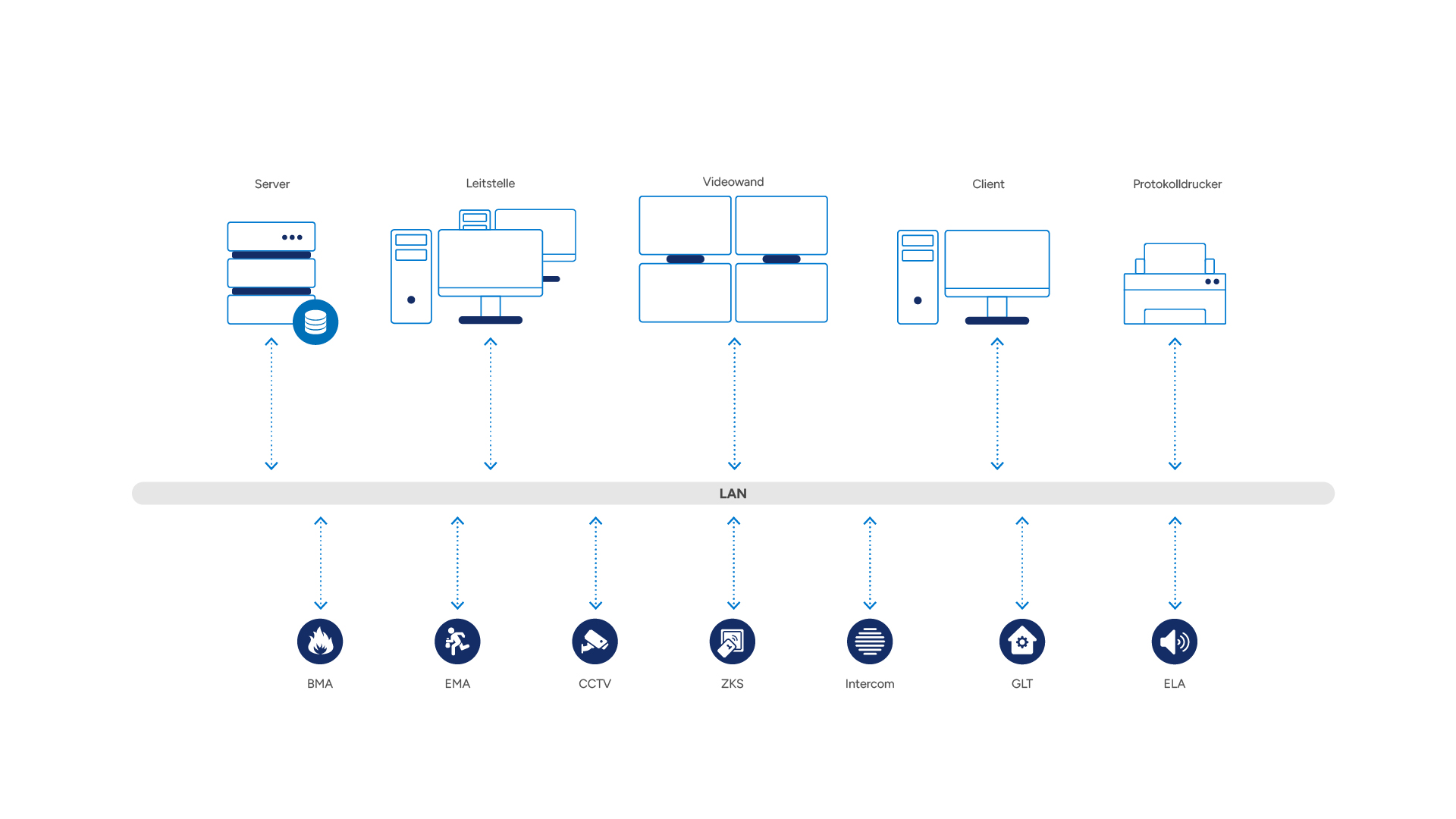 Mit seinem umfangreichen Portfolio an Schnittstellen stellt WinGuard die perfekte Verbindung zu Brandmeldeanlagen und anderen Sicherheits-, Gebäudemanagement und Kommunikationssystemen her. Automatische Importfunktionen von z. B. CAD-Grundrissplänen und Meldern ermöglichen eine schnelle Konfiguration.