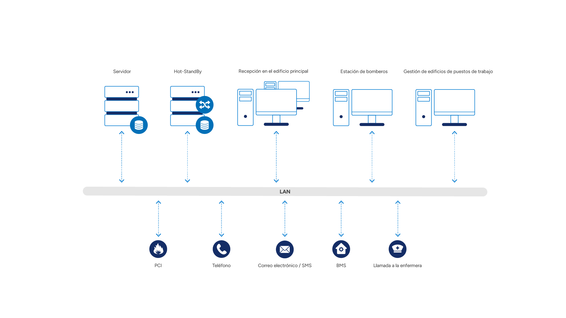 Como sistema independiente del fabricante, WinGuard integra todos los subsistemas técnicos existentes, entre ellos sistema de detección de incendios, GLT y llamada de enfermería.