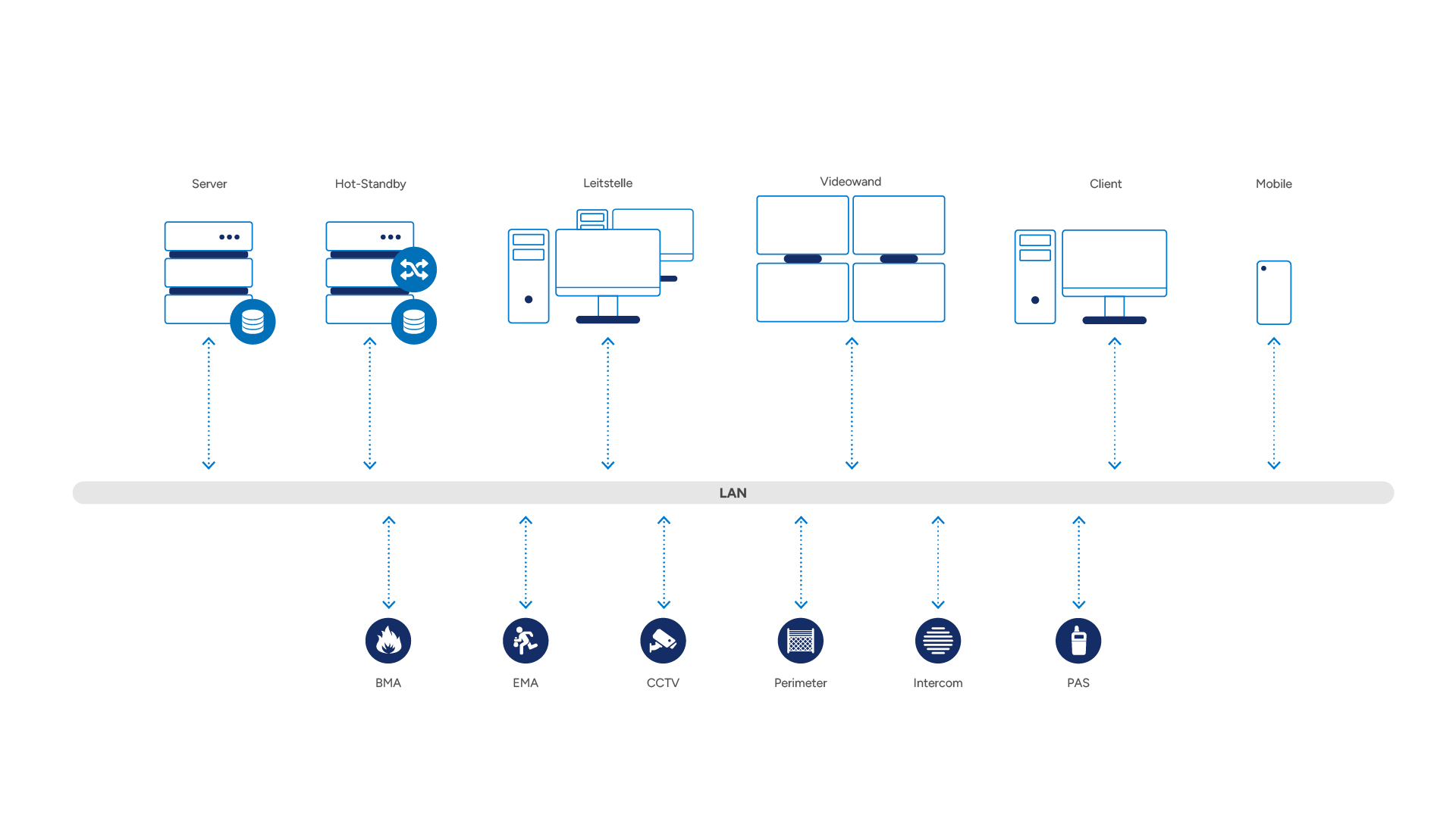 Hohe Redundanz wird durch einen Backup- und Schnittstellenserver realisiert. Jedes System ist redundant angebunden, so dass auch bei einer Störung in der IT-Infrastruktur die Überwachung in der Leitstelle weiterhin möglich ist.
