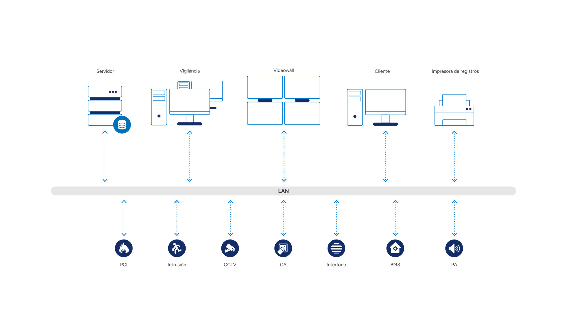 Con su amplia cartera de interfaces, WinGuard proporciona la conexión perfecta con los sistemas de alarma de incendios y otros sistemas de seguridad, gestión de edificios y comunicación. Las funciones de importación automática de planos CAD y detectores, por ejemplo, permiten una configuración rápida.