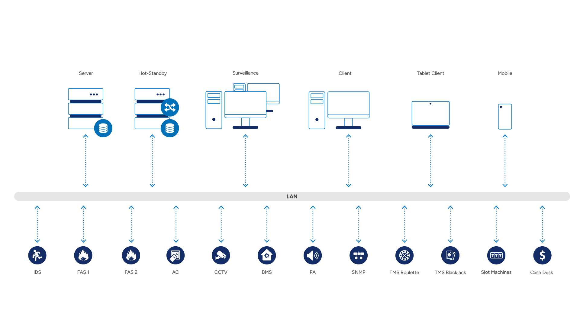 The casino-specific modules and the perfectly integrated interfaces of the management platform solve this task with all necessary procedures and tracking possibilities, being simultaneously displayed in each casino as well as in the control center. Key factor for organizational flexibility and fast response is the mobile notification by the platform. Status information, notifications, messages and alarms are transferred to mobile devices, such as smart phones, via a push process in the casino network, for further evaluation and processing.